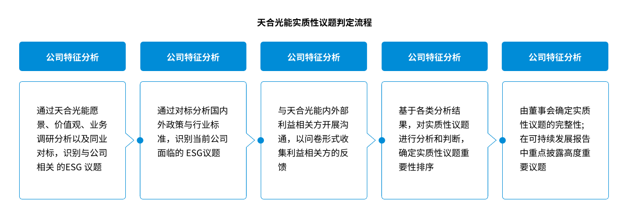 基于天合光能愿景、价值观与所处行业特征,公司对标国内外行业政策标准,同时结合利益相关方沟通和调研结果、公司管理层讨论与专家建议,就实质性议题进行重要性排序。