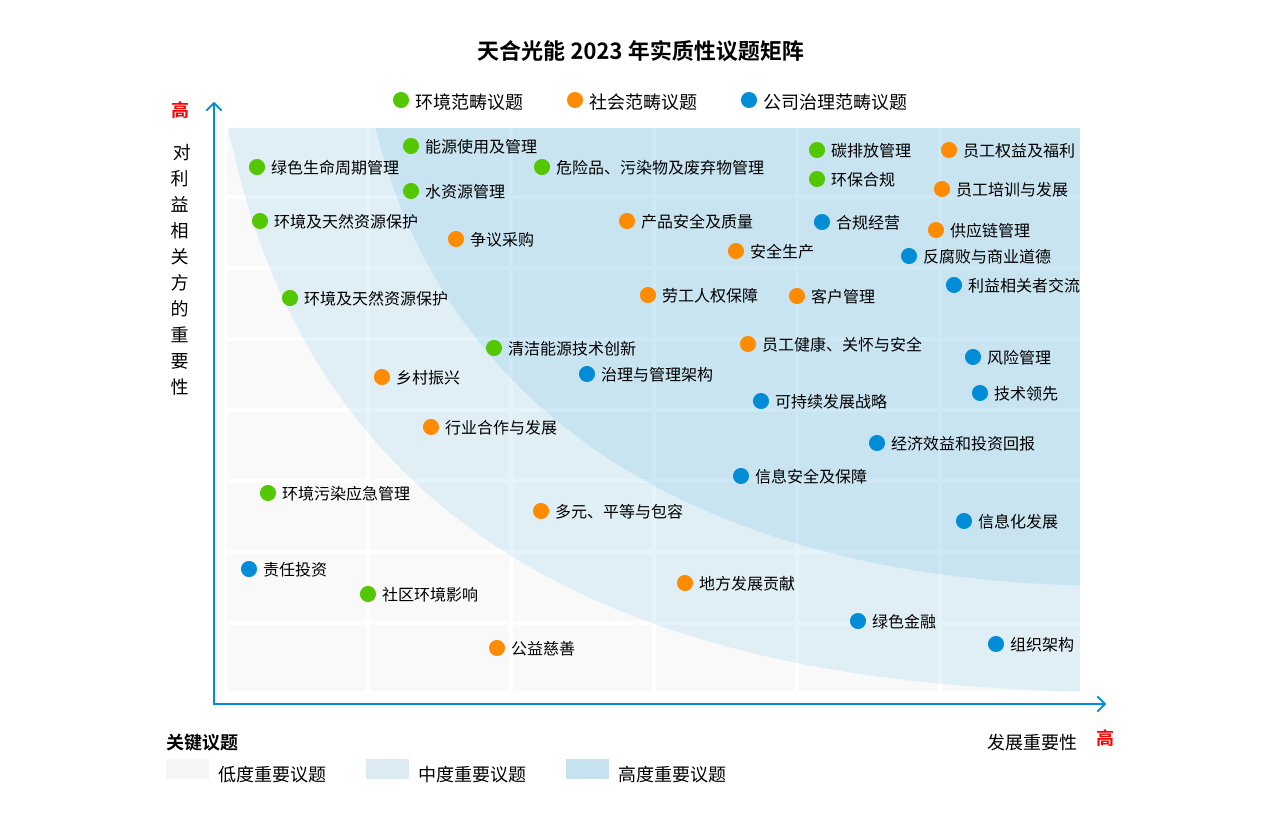 在 2023 年实质性议题矩阵中,我们识别出 38 项具有实质性影响的可持续发展议题,其中对于天合光能及利益相关方均切实关键的高度重要议题 25 项。所有高度重要议题已参照 GRI 标准并结合公司现况充分回应。