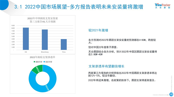 中国跟踪支架市场2021年安装量为近四年来最低,主要原因是受国内地面电站安装量影响,跟踪支架的渗透率较2020年仅降低0.78%,基本持平。2022年随着电力消纳方式逐渐明朗,大基地项目的有序开工,大宗商品的供需稳定,组件价格回落,跟踪支架的安装量将有大幅上涨。多家第三方调研机构预测,中国跟踪支架2022年将迎来激增,市场渗透率有望翻倍。