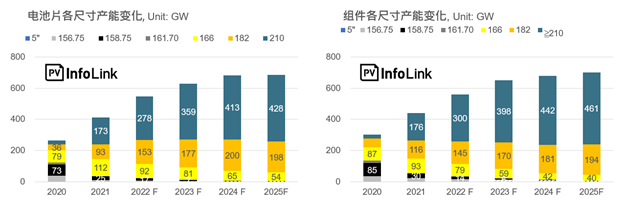 2021年年底,大尺寸组件产能超过290GW,210首次超过182(来源:PV InfoLink)