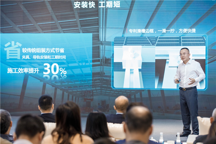 在听取了业界专家的建议和点评后,天合智慧分布式副总裁张荣敏也分享了“天能瓦”的设计初衷,“天合蓝天从中国传统建筑结构中汲取智慧,将工匠精神与现代科技完美结合,其采用榫卯结构和无导轨设计,各个构件之间的结点以榫卯相吻合,组成安全、紧固的框架体系,同时兼顾施工运维的便利性,显著减少施工环节,节省支架和人力成本,因此,‘天能瓦’具有更安全、更高收益、更快捷等主要优势。”