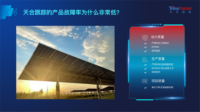同时,唐程银经理在演讲中指出,从光伏电站的运维成本占比来看,跟踪支架和固定支架的运维费用差距并不大,但跟踪支架对项目整体发电量有所提升、经济性更好。在光伏电站全年运维费用里,跟踪支架全年运维费用约0.0004元/w/年,仅占1-5%。其中,直接运维费用约0.0002元/w/年,间接运维费用和故障率有关,费用基本在0.0002元/w/年。天合跟踪在设计质量、生产质量和项目质量中都有严格的质量把关,严格的供应链质量管理体系标准下的产品故障率非常低。以宁夏2P跟踪支架项目为例,天合跟踪在制动器、TCU、NCU、电机和轴承等关键部件上,故障率显著低于行业平均。目前,天合跟踪拥有多家第三方权威认证机构背书,并获得DNV发布的单轴跟踪系统可融资审核报告。产品通过机械载荷测试和功能性测试,并进行户外实证确保发挥优秀性能。