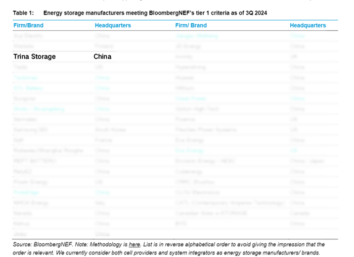 近日,彭博新能源财经(BNEF)发布2024年第三季度全球Tier1一级储能厂商榜单(BNEF Energy Storage Tier 1 List 3Q 2024),天合储能凭借可靠的产品质量、领先的技术实力以及超高的可融资性再次登榜。本次上榜,是BNEF今年1月首次发布Tier1一级储能厂商榜单以来,天合连续三季度获得这一荣誉,充分显示天合储能的综合实力,也是对其在全球能源转型中积极贡献的肯定。
