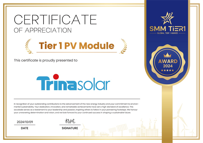 近日,由SMM举办的2024欧洲零碳之路光伏&储能峰会在比利时隆重举行。会上,天合光能凭借可靠的产品质量、领先的系统集成能力以及全球品牌力,从光伏全产业链超过900+家企业脱颖而出,集光伏组件、储能和跟踪支架多业务,同时荣登SMM 全球Tier1榜单。本次上榜,不仅展示了天合光能的综合实力,也是对其在全球能源转型中积极贡献的充分认可。