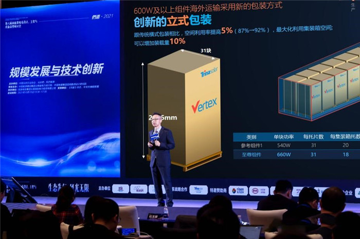 张映斌博士在演讲中提到,海外以集装箱运输为主,受集装箱2.58米的门高所限,行业有声音认为组件宽度将被限制在1.135米以内,不可逾越。但事实上,天合光能不仅打破了尺寸桎梏,技术工程团队经过广泛调研、深度研究,更一举打破包装传统,创新开发了立式包装解决方案:和传统横式包装相比,可以增加装载量10%,集装箱空间利用率提高5%,最大化利用集装箱空间。在海运费用节节攀升的大背景下,假如从中国到欧洲,以现在主流价格1万美元每箱的运费为例,换算成人民币,创新包装可节约运费2分钱每瓦!