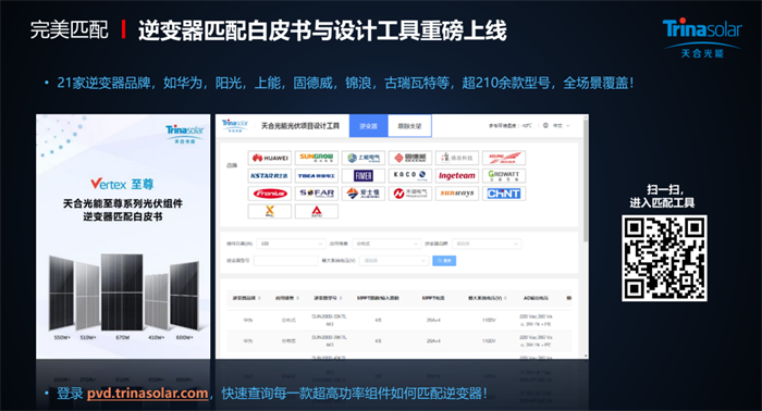 基于对光伏电站三大主材之一的逆变器匹配的重视,天合光能与600W+联盟成员合作完成并发布了正式发布的《天合光能至尊系列光伏组件逆变器匹配白皮书》暨全球范围内光伏行业首个逆变器智能匹配数据库,在逆变器全面适配210至尊全系列组件后,为不同应用场景的逆变器匹配提供清晰参考,为超高功率组件分布式应用铺平道路。天合推出的首个逆变器匹配工具(pvd.cheerwe.com)也成为了210超高功率组件上屋顶的有力武器,一经推出便广受好评。