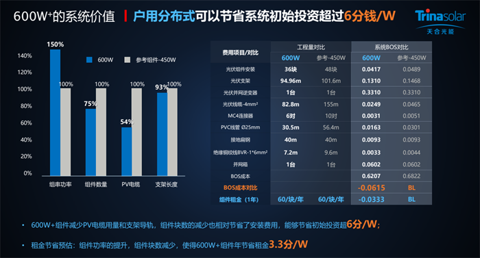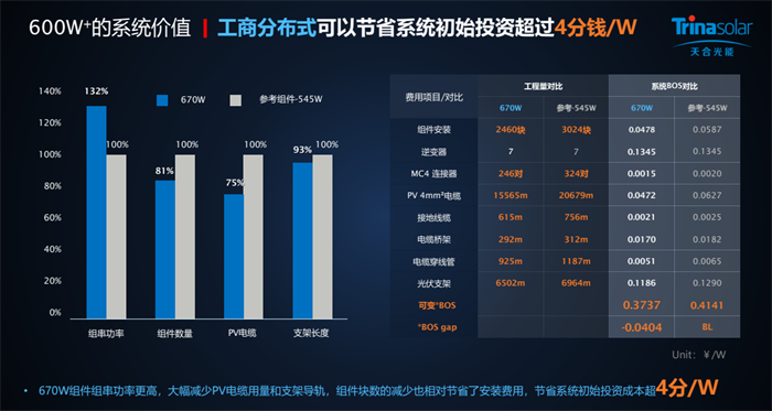 就在近期,国内权威测算专家对210至尊系列组件全场景度电成本优势和收益进行了深入研究: 600W+至尊系列组件的系统成本与度电成本均优于行业参考450W和545W组件。在户用分布式场景下,至尊600W组件对比参考450W组件,节省初始投资成本达到6.15分/W,而且由于组件功率提升,安装块数减少,使得600W+组件年节省租金3.3分/W。在工商分布式场景下,至尊670W组件对比参考545W组件,节省系统初始投资超过4分钱/W。