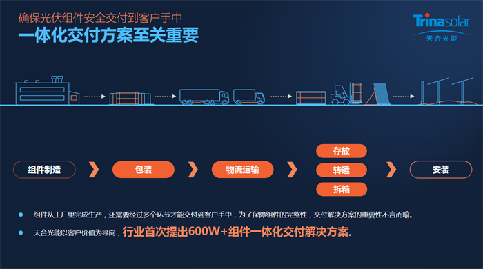 此次项目运输方式为国内标准化的平板车运输,600W+组件采用传统的横式包装。天合具备了一套完成的包装-物流-交付体系,层层把关,环环相扣,旨在将组件安全迅速交付到客户手中。