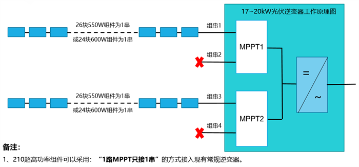 “1路MPPT只接1串”的接线图(图中红色不能接入)
