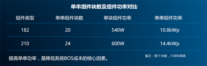 提高单串功率,是降低系统BOS成本的核心因素之一,得益于210至尊组件的低电压特性,以天合210-600W(Voc=41.5V)组件与友商182-540W(Voc=49.6V)组件对比: