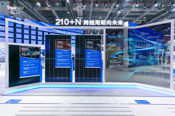 天合光能自主研发的三款高效电池组件并列展示在“210+N创领展区”,全部搭载210产品技术平台,分别叠加采用i-TOPCon电池技术、TSHJ异质结电池技术、THBC背接触异质结电池技术,最高组件输出功率达760W。700W+星时代,天合光能将构建N型时代新型高效电池全面格局体系,让多元技术在不同应用场景协同发展。