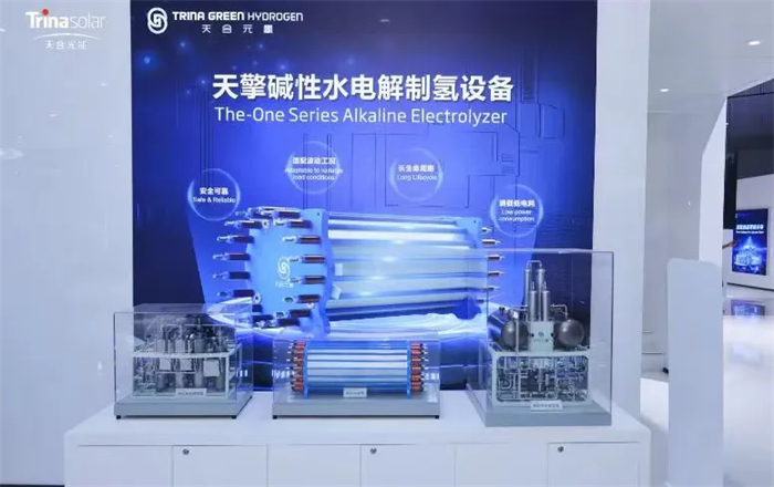 本次展会上,天合元氢携橇装式制氢装备——天擎系列碱性水电解槽、集装箱式制氢装备、移动式制氢装备及“光储氢”一体化解决方案亮相。自2023年天合元氢发布首款大型碱性水电解槽——天擎系列产品以来,已完成多个项目交付,在项目现场,天擎系列产品稳定运行,已实现无泄漏、无短路、无打火的运行状态。尤其是在低负荷工况下,实现了30%电力负荷状况下平稳运行8小时以上,氧中氢纯度仍能保持稳定不超标。