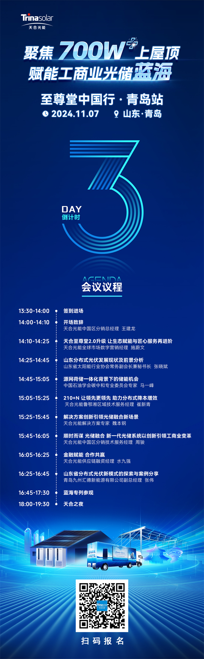 在初冬之际,魅力海滨 —— 青岛,11 月 7 日,至尊堂中国行将点亮齐鲁大地。届时,天合光能至尊堂将继续携手行业伙伴共创辉煌,一同探寻光储融合的崭新方向,助力工商业光储生态的蓬勃发展,我们诚挚期待您的到来!