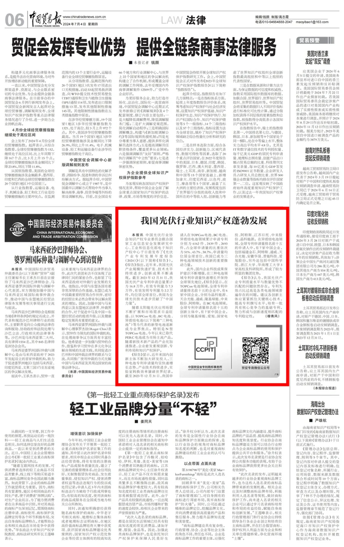 中国贸易报刊发《我国光伏行业知识产权蓬勃发展》。