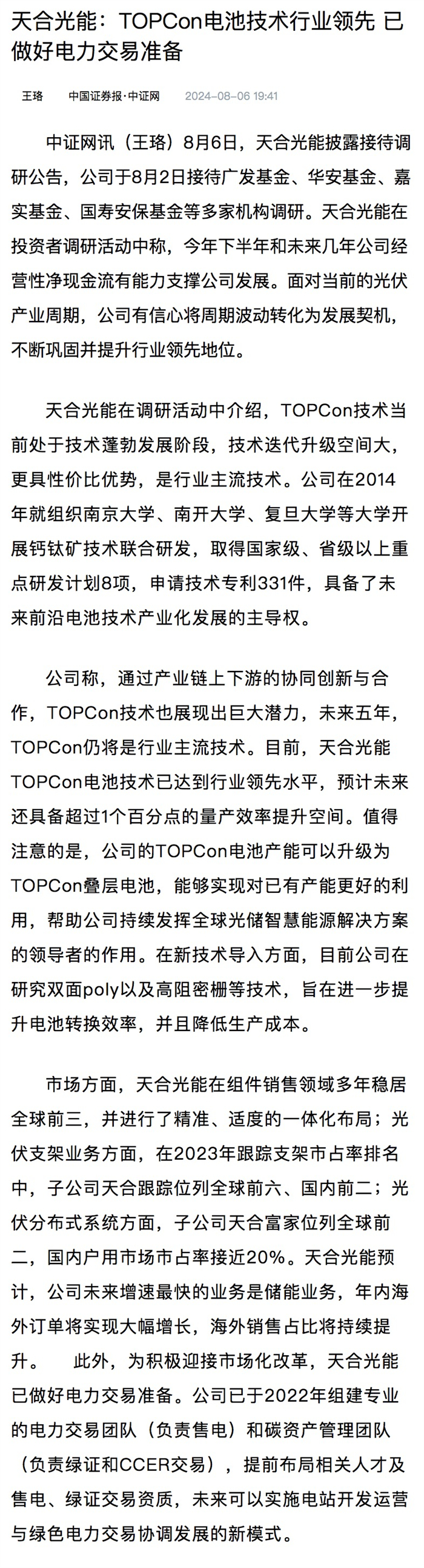 中国证券报刊发《天合光能:TOPCon电池技术行业领先 已做好电力交易准备》。