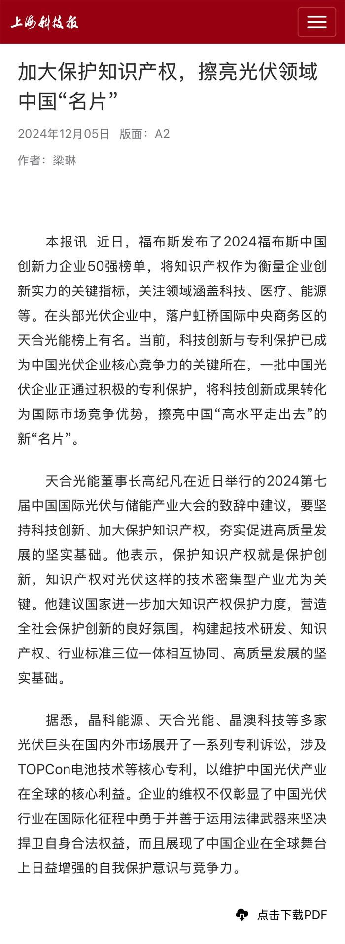 12月5日,上海科技报刊发《加大保护知识产权,擦亮光伏领域中国“名片”》。