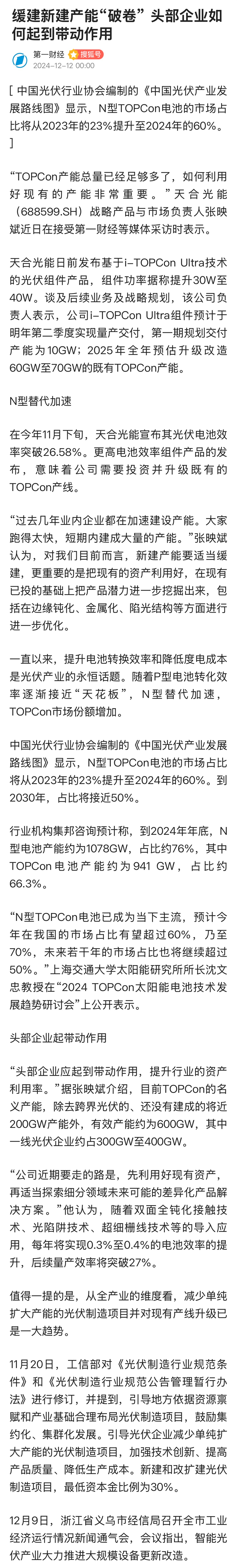 报道指出,光伏产业技术创新迭代加速。2024年,N型产能快速释放,其中的TOPCon技术路线已成为当之无愧的主流技术路线。天合光能深耕N型先进技术路线,持续迭代升级TOPCon技术。