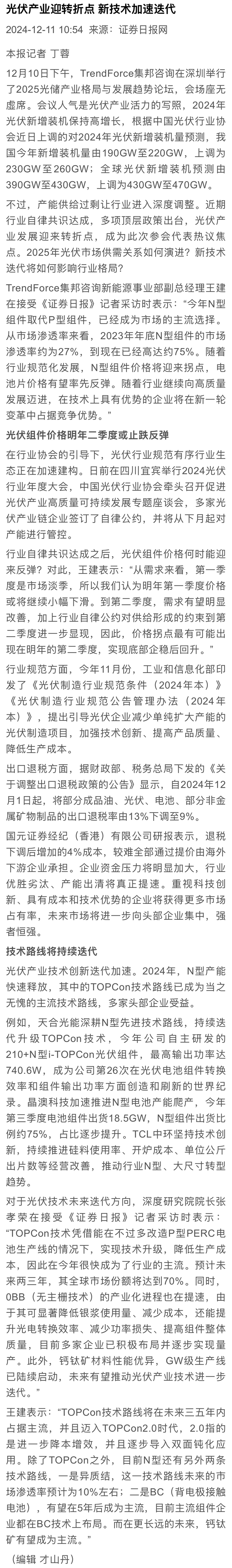 证券日报刊发《光伏产业迎转折点 新技术加速迭代》。