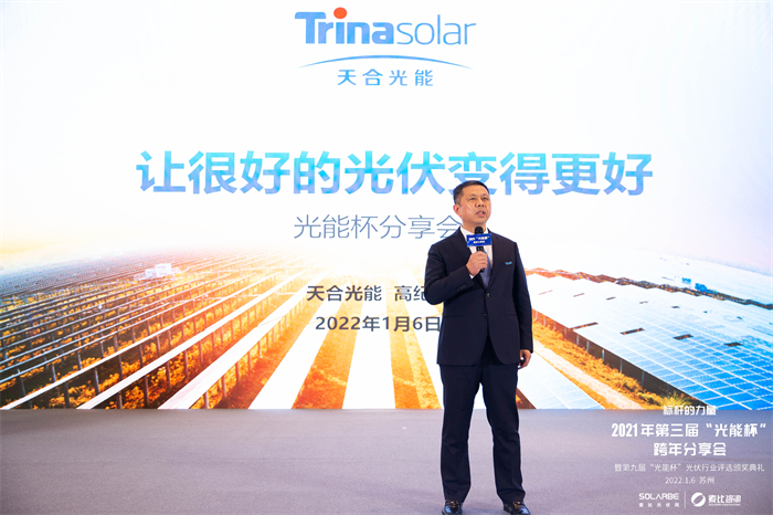 在企业家跨年分享环节,天合光能高纪凡发表了 “让很好的光伏变得更好”的主题演讲。高纪凡称,“双碳”战略等国家政策为光伏行业营造了良好的外部环境。对于天合光能而言,2021是先进的210产品全线“通车”的一年。天合光能210组件累计出货量超16GW,至今超高功率组件的应用已经覆盖全球,包括众多海外GW级和百兆瓦级的项目。这也是整个600W+产业链的丰硕成果。