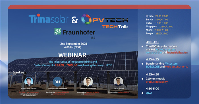 北京时间9月2日晚上10点 ,国际知名主流媒体PV Tech举办国际研讨会,天合光能、权威第三方测算机构Fraunhofer受邀参加,共同探讨600W+组件产品可靠性和系统价值在降低LCOE上的重要性。