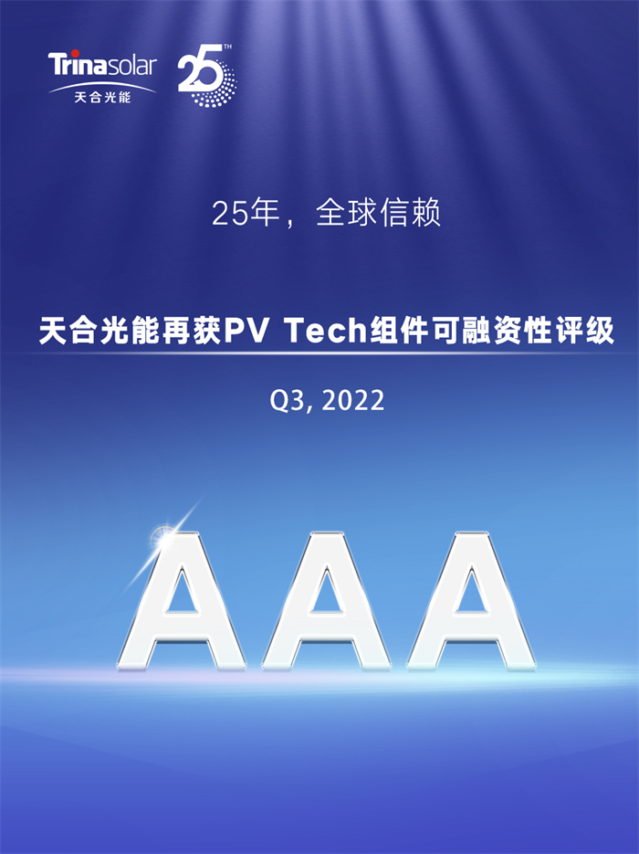 近日,PV Tech发布2022年第三季度组件制造商可融资性评级报告,天合光能以绝对优势蝉联AAA可融资性最高评级,这是继第二季度获得该可融资性最高评级后,天合光能卓越的技术创新能力、产品价值、财务表现再获认可。而此前,天合光能连续六年获得彭博新能源财经100%可融资性评级,全球金融市场及太阳能行业对天合光能及其产品均充满信心。