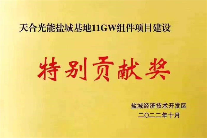 项目于今年6月开工建设,仅用105天实现建设工程全部竣工并进入设备安装调试阶段,13天实现从设备安装到首片产品下线,刷新了天合建设速度,盐城开发区管委会委托光电产业园书记周翔,向公司颁发“特别贡献奖”。