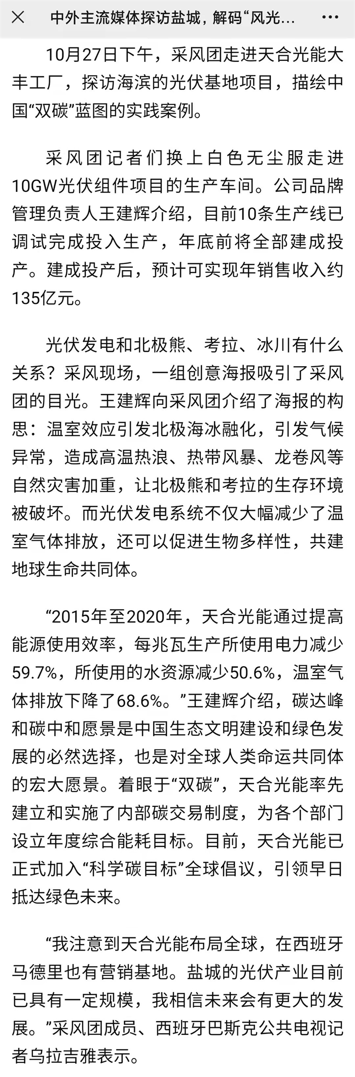 光伏发电和北极熊、考拉、冰川有什么关系?采风现场,一组创意海报吸引了中外主流媒体采风团的目光。全球变暖等气候问题是全球关注的话题:温室效应引发北极海冰融化,引发气候异常,造成高温热浪、热带风暴、龙卷风等自然灾害加重,让北极熊和考拉的生存环境被破坏……中外媒体记者陷入了沉思,如何更好地为地球降温,为“绿水青山就是金山银山“提供实践案例,天合光能给出了答案:光伏发电系统不仅大幅减少了温室气体排放,还可以促进生物多样性,共建地球生命共同体。2015年至2020年,天合光能通过提高能源使用效率,每兆瓦生产所使用电力减少59.7%,所使用的水资源减少50.6%,温室气体排放下降了68.6%。着眼于“双碳”,天合光能率先建立和实施了内部碳交易制度,为各个部门设立年度综合能耗目标。目前,天合光能已正式加入“科学碳目标”全球倡议,引领早日抵达绿色未来。