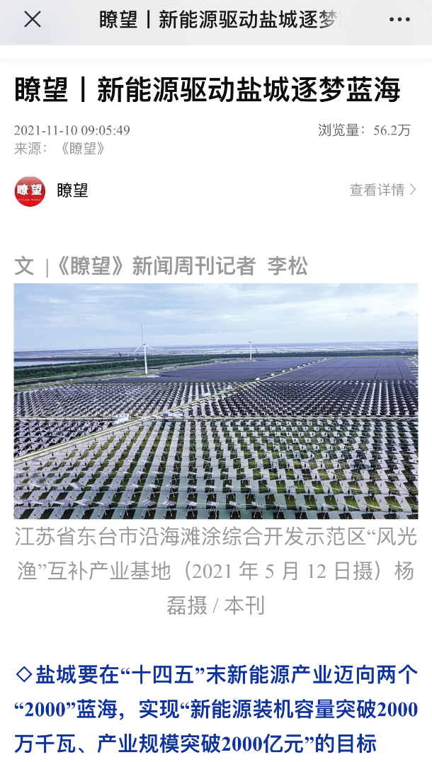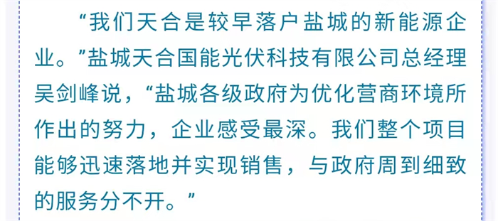 “天合光能等一大批大型知名光伏装备制造企业在盐城实现全球布局……” 《瞭望》新闻周刊记者李松写道,天合在盐城良好的营商环境中实现快速发展。正如盐城天合国能光伏科技有限公司总经理吴剑峰所言,天合是较早落户盐城的新能源企业,盐城各级政府为优化营商环境所作出的努力,企业感受最深。天合整个项目能够迅速落地并实现销售,与政府周到细致的服务分不开。