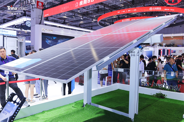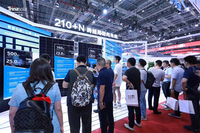 天合光能持续以领先的技术走在光伏行业前沿,在多技术路线均有深厚的技术储备。作为210产品技术平台和N型i-TOPCon技术的开拓者,一路引领行业实现了从500W到600W再到700W里程碑式的功率跨越;天合光能多次打破世界纪录,4月底,其210+N型i-TOPCon光伏组件最高输出功率达740.6W,第26次创造了世界纪录。本次展台“210+N创新展区”左侧,除了该款组件,其自主研发的TSHJ异质结电池和THBC背接触异质结电池技术也亮相展会,最高组件输出功率达760W+。