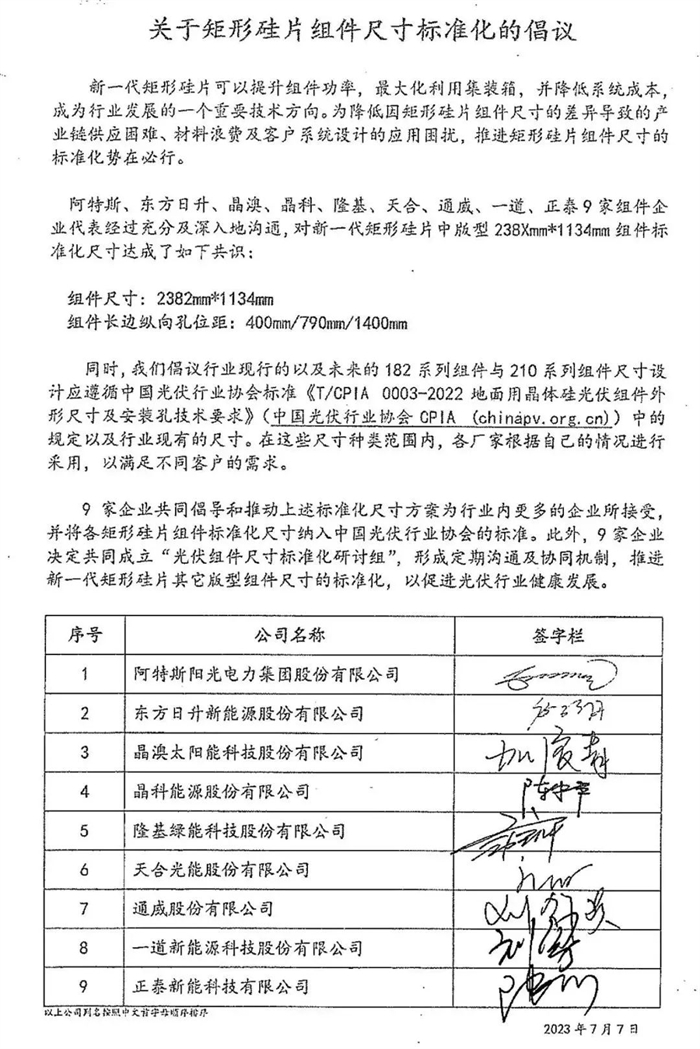 秉持“利他”初心,去年3月,天合光能全面公开210R产品解决方案及产业化可行性路径,呼吁行业矩形硅片电池组件尺寸统一;去年7月,天合光能联合行业8家组件企业代表,就2382mm*1134mm的矩形硅片中版型组件尺寸达成共识,至此,中版型矩形硅片组件完成尺寸标准化。统一组件尺寸标准对整个行业都产生重大利好,将降低产业链成本,带来规模化发展,充分释放整个产业价值。