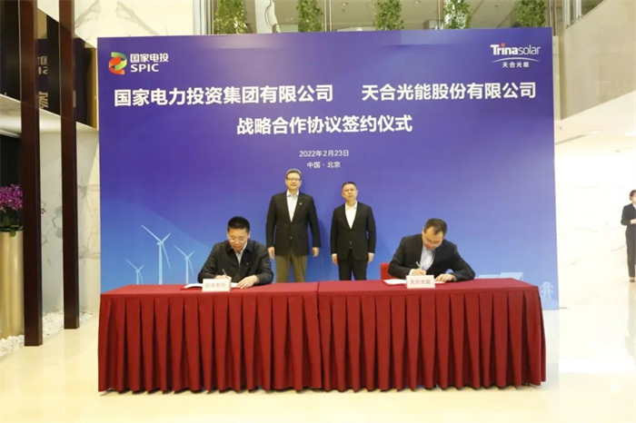 2月23日,在天合光能董事长兼CEO高纪凡、国家电投党组书记、董事长钱智民的共同见证下,国家电投党组成员、副总经理徐树彪与天合光能常务副总裁曹博代表双方签署战略合作协议。
