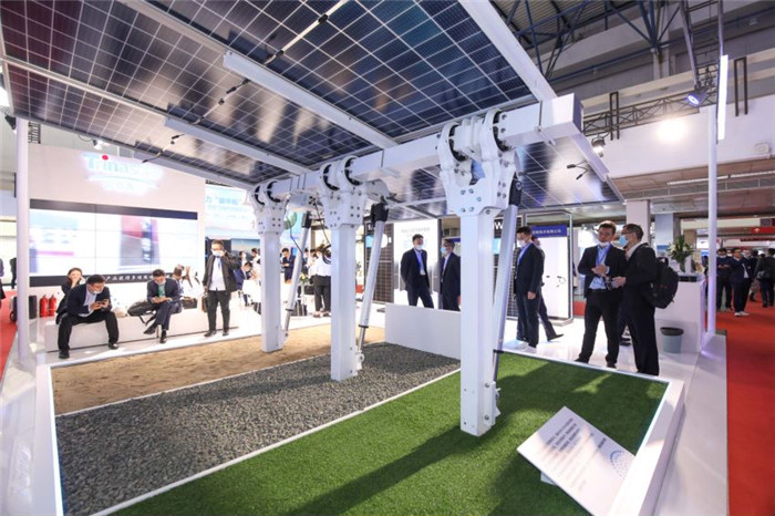 除了210至尊组件系列,在天合展台上格外吸引观者瞩目的是天合跟踪支架产品——新一代开拓者2P支架。这款产品于今年1月获得IEC认证,开启全面适配600W+超高功率组件的先河,进一步增加发电收益、降低度电成本,优化升级系统价值,发电量增益最高可达到8%,这次展会上,开拓者2P装配的就是目前最高功率的670W至尊组件。