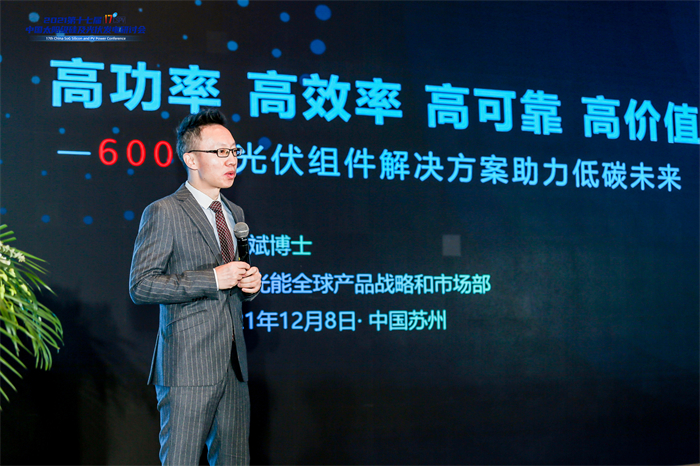 12月7-9日, 第十七届中国太阳级硅及光伏发电研讨会(17th CSPV)在苏州召开。天合光能全球市场与产品负责人张映斌博士出席大会主题论坛,并作了《高功率 高效率 高可靠 高价值——600W+光伏组件解决方案助力低碳未来》的主题演讲。