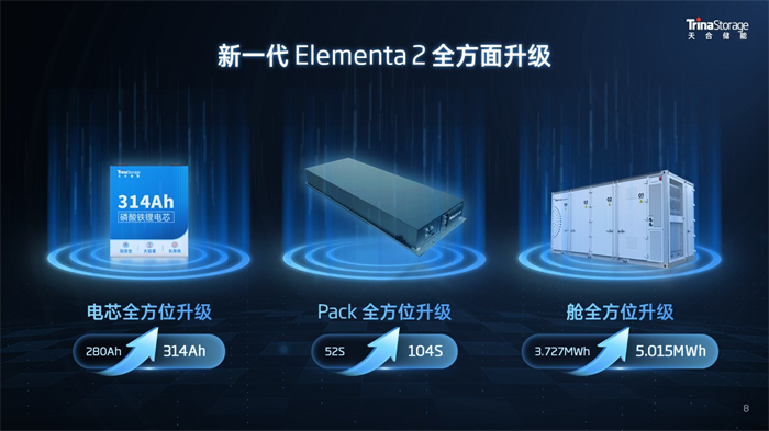 2024年Q2,天合光能新一代柔性储能电池舱Elementa 金刚 2已全面量产并交付发往全球,这也是行业为数不多正式交付的5MWh产品。Elementa 2搭载314Ah自研天合芯,实现20呎/5MWh 容量与成本的完美平衡,完备的产品认证确保安全品质。新一代工商储解决方案Potentia蓝海,采用A级优+超高转化效率电芯 (RTE≥95%),搭载电芯-PACK-柜体一站式自研安全系统,迈入工商业储能新阶段。