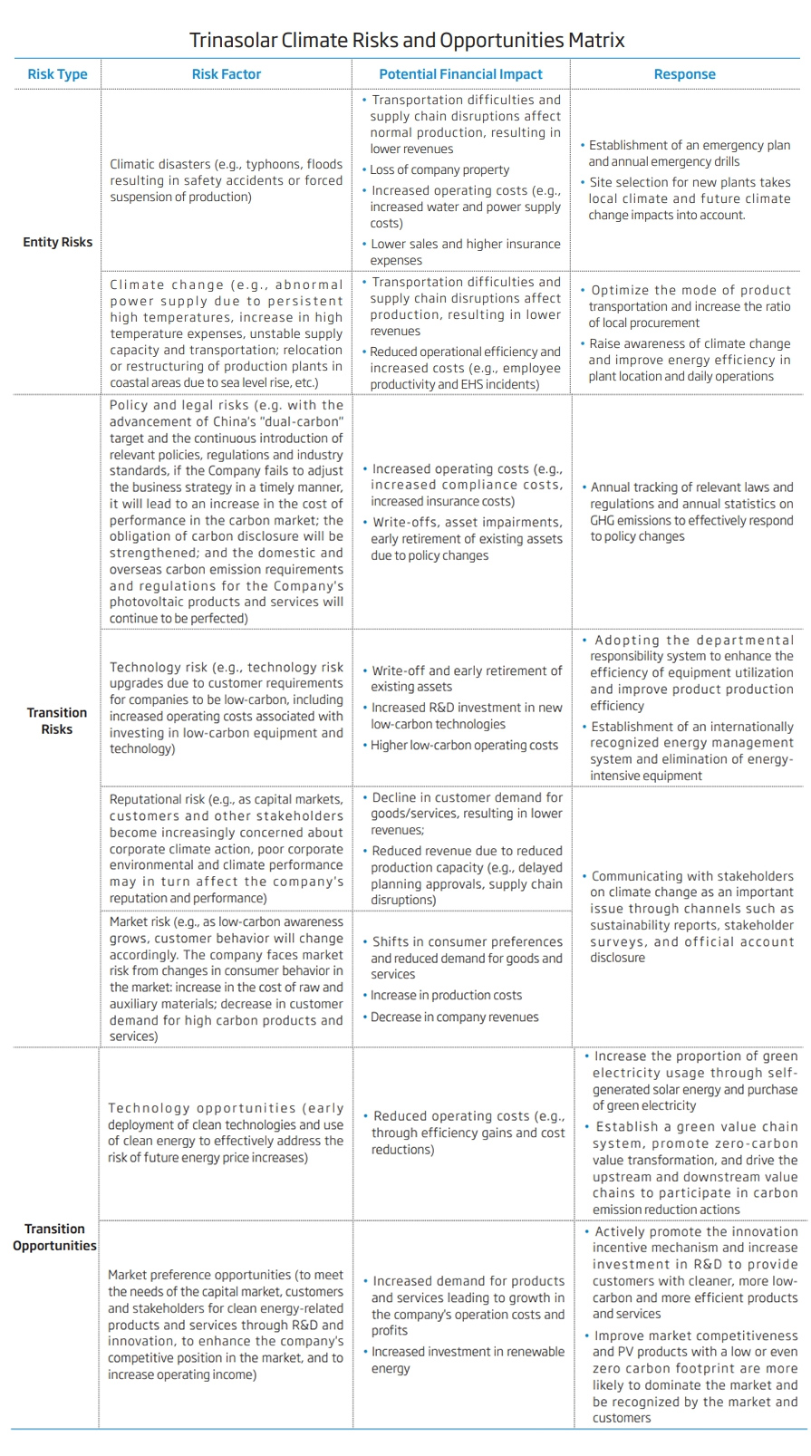 By conducting policy research, benchmarking with peers, and combining expert opinions, Trina Solar has identified the following climate change-related risks and opportunities of business development and operations, and assessed the impact of each risk and opportunity on the company's financial performance.
