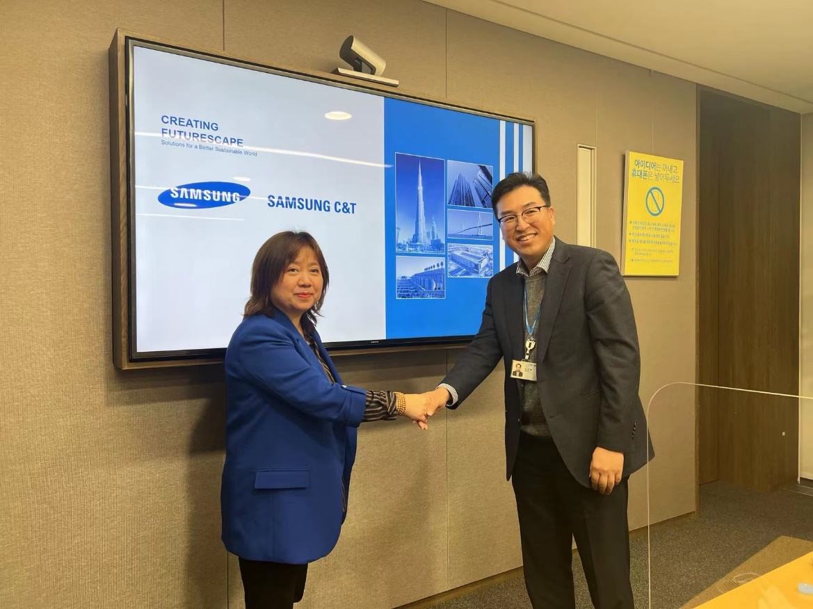 On December 2, 2022, Helena Li, President of Trina Solar BG, visited the headquarters of Samsung C&T in South Korea to discuss strategic cooperation with Kim Juyoul, Vice President, Head of Procurement & Estimation Department
