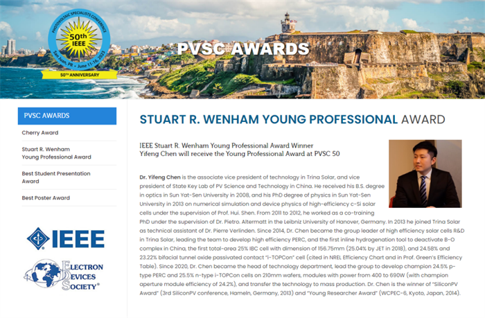 The 50th IEEE (The Institute of Electrical and Electronics Engineers) Photovoltaic Specialists Conference (IEEE PVSC) recently announced that Dr. Yifeng Chen, technical leader and associate vice president of technology in Trina Solar, will receive the 2023 IEEE Stuart R. Wenham Young Professional Award for his outstanding achievements in the science and technology of photovoltaic energy conversion.