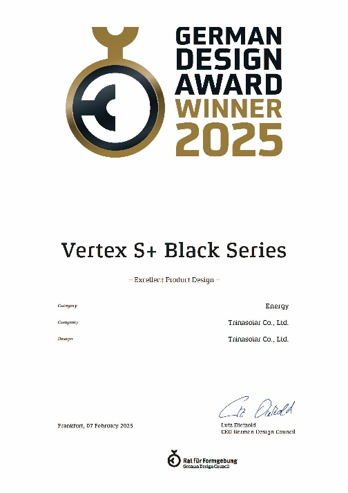 Recently, the German Brand and Design Council officially announced the winners of the 2025 German Design Award. Among the distinguished recipients, Trinasolar's Vertex S+ Black Series has once again claimed a prestigious position. This is the second time the series has received this accolade, following its initial win in 2023. Receiving this honor just one year after its first award highlights the Vertex S+ Black Series’ exceptional design and innovation. It underscores Trinasolar's unwavering commitment to excellence and its ability to consistently meet the high standards set by the German Design Award jury.