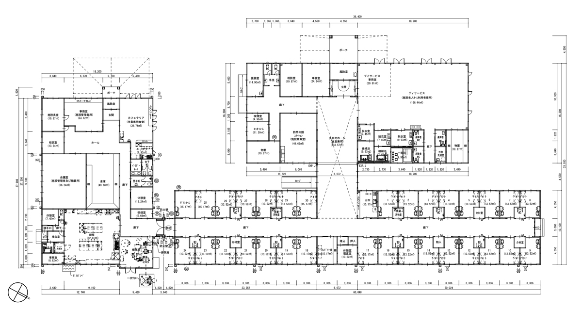 建物は、建設地の形状に合わせて南北に長く配置している。南北に延びる中廊下の両側に入居者の個室が30室並ぶ。デイサービスエリアや訪問介護ステーション、事務室などが入る棟と、厨房や倉庫、職員用のカフェテリアなどが入る棟がその西側と南側にそれぞれ接続する。中廊下にはトップライトを設け、昼間には自然採光で一定の明るさを確保するようにした。