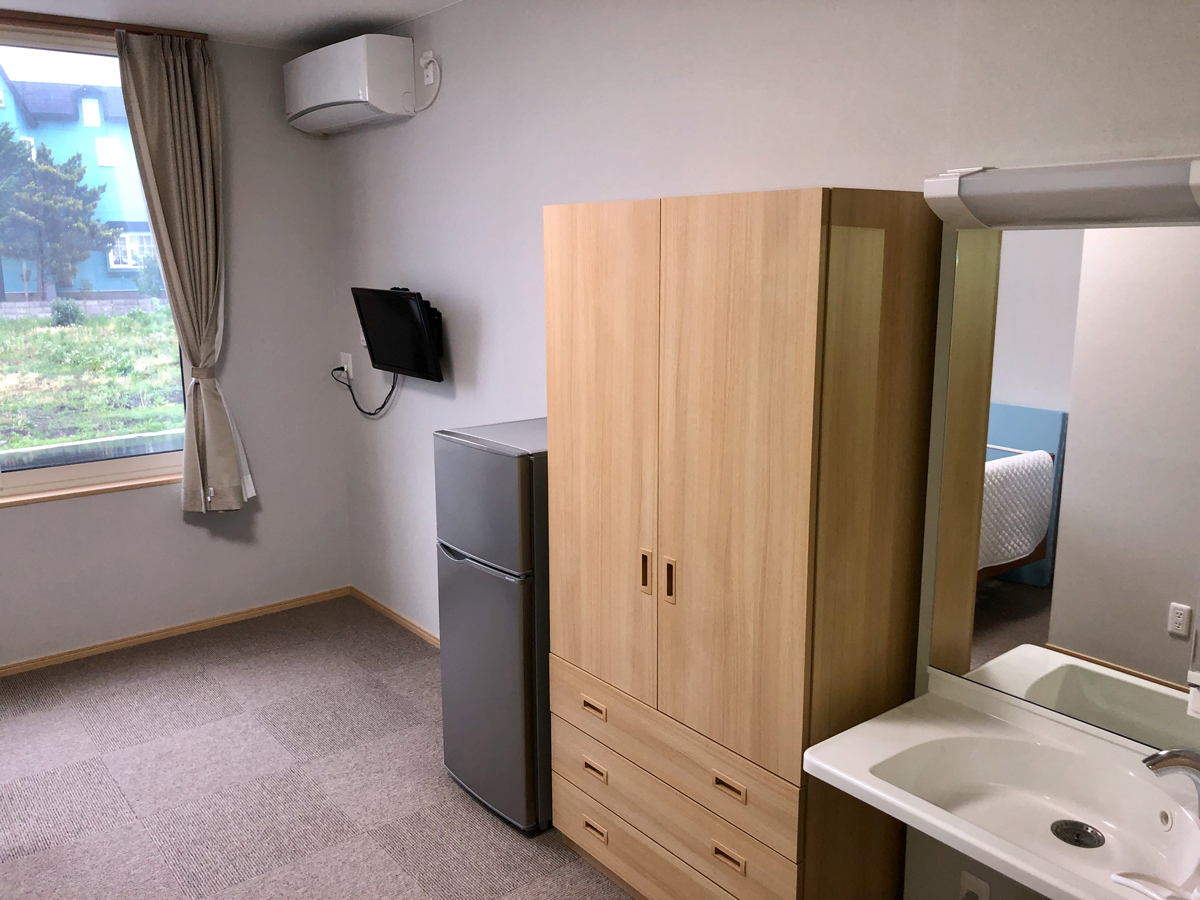 事務室や多目的ホールなどの大空間、昼間の滞在時間が長い部屋の暖冷房には、補助対象となる複数制御の寒冷地仕様のパッケージエアコンを採用した。入居者の個室などには寒冷地仕様のルームエアコンを設置している。