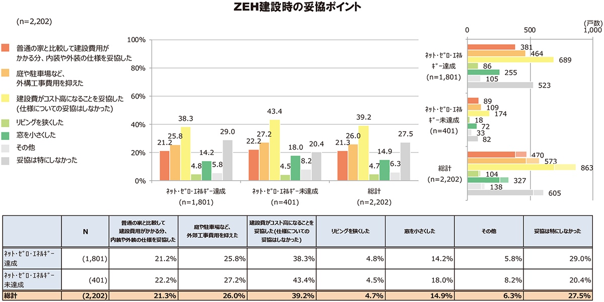 マイホームにZEHを選んだ建て主は、ZEH建設に伴うコスト増をどう考えたのか。2016年度の事業者に聴取した「ZEH建設時の妥協ポイント」は、「建設費がコスト高になることを妥協した」の割合が最も高い。次に「庭や駐車場など外構工事コストを抑えた」が続く。