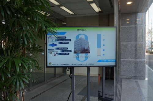 2018年に設備の更新工事を実施してZEB Readyとした。建物の外観には工事に伴う変更が生じていないが、省エネ性能の向上をアピールした要素が玄関まわりに2カ所ある。1つはエントランスホールに置いたモニターだ。ZEBに対するビルオーナーの取り組みや、建物内の電気消費量と発電量などを画面に映し出し、前面道路から見られるようにしている。また玄関の上部のガラス面には、5つ星のBELS(建築物省エネルギー性能表示制度)評価を示したラベルも貼ってある。