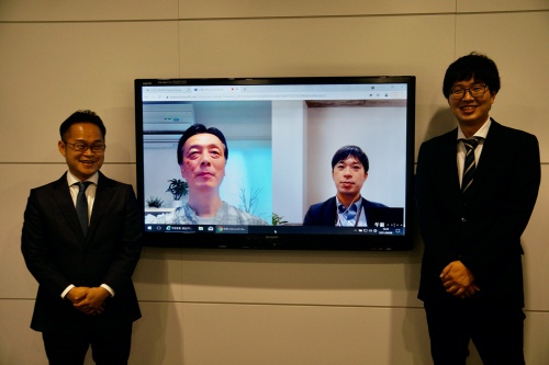 渡辺パイプ総務ユニット建築・営繕グループの竹中耕司グループリーダー(左端)と同グループ建築担当の土橋弘典氏(右端)。画面内は大和ハウス工業の担当者。左が近畿設備技術部環境・設備Gの谷口和紀主任技術者、右が仙台支社北海道・東北設計部北海道設計課の児玉俊介主任(写真:守山 久子)
